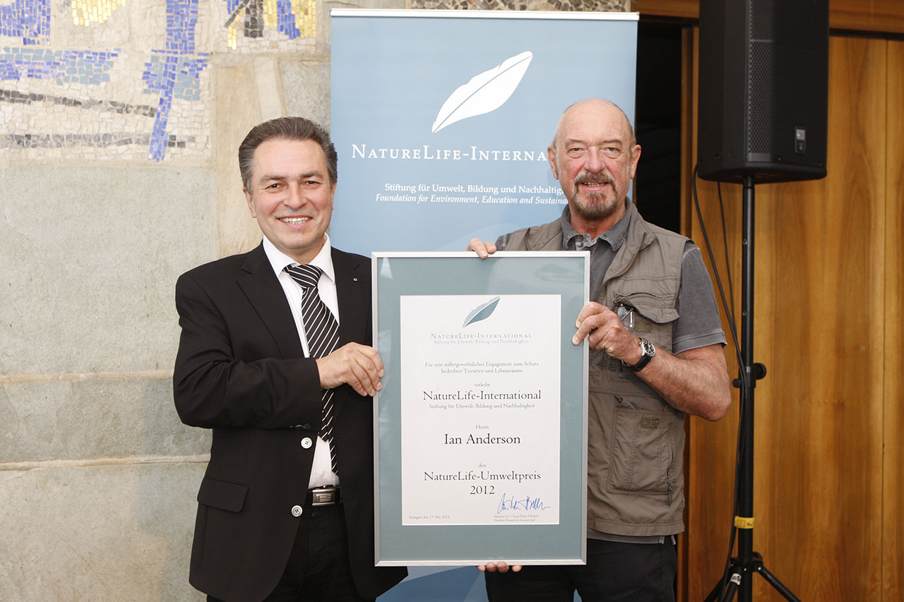 Ian Anderson, Gründer und Kopf der legendären Rockgruppe Jethro Tull und erfolgreicher Solokünstler, wurde von uns mit dem „NatureLife-Umweltpreis 2012“ ausgezeichnet. Schließlich ist Ian Anderson nicht nur Wegbereiter für musikalische Vielfalt, sondern auch Vorbild in Sachen Ökologie. Mit großem persönlichen Engagement und über Jahrzehnte hinweg setzt sich der beliebte Musiker für die biologische Vielfalt ein. Anderson war einer der ersten Schirmherren für die Kampagne zur Rettung des heute als Welt-Naturerbe geschützten St. Lucia Reservats in Südafrika, das durch Tagebau-Projekte gefährdet war. Darüber hinaus pflanzte er in Schottland über 35.000 Eichen- und Eschenbäume und rettete Waldgebiete durch den Aufkauf von Ländereien. Mit der finanziellen Unterstützung von Forschungs- und Schutzprojekten engagiert sich Ian Anderson zudem für bedrohte Wildkatzenarten.